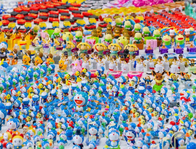 Years later, in response to the glut of toys in his own family, he developed a community exchange marketplace operating on a barter economy, named ‘Kaekko’ (Japanese for ‘swapsies’). There have been over 5,000 Kaekko Bazaars since 2000, contributing to the artist’s enormous collection of unwanted plastic toys. These are the toys Fuji transforms into his evocative and captivating artworks.